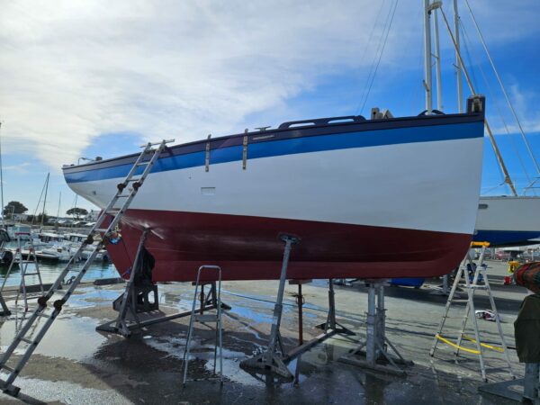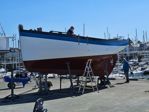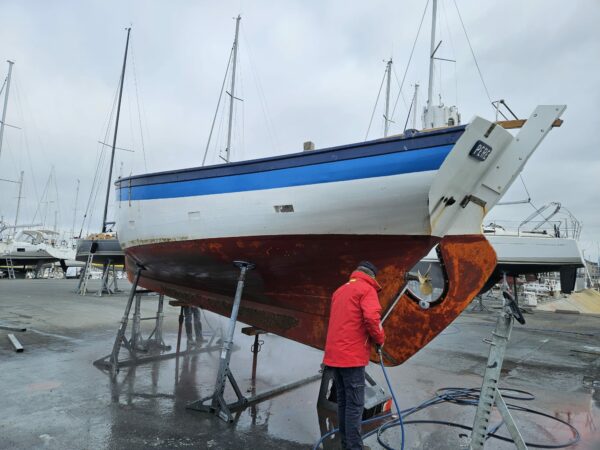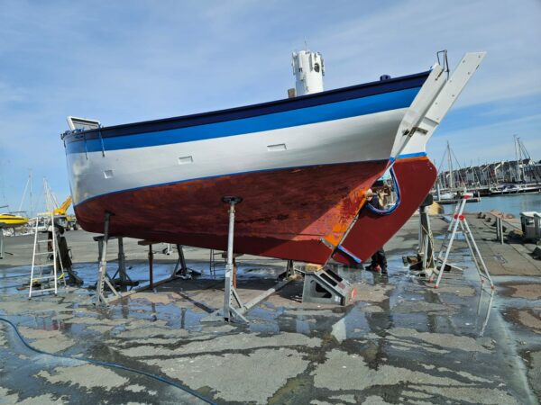 Les travaux se sont poursuivis par une 1ère couche de bleu foncé, une 1ère couche de bleu clair, une 1ère couche de blanc et une 1ère couche d’antifouling