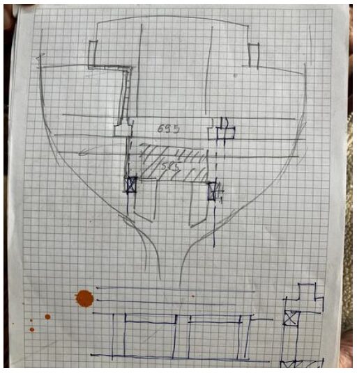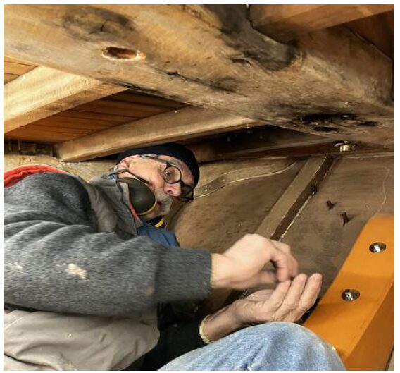 De gros travaux sont prévus sur l’étambot. Patrick s’y est attaqué avec enthousiasme. Le démontage des bordés pour y accéder est terminé.