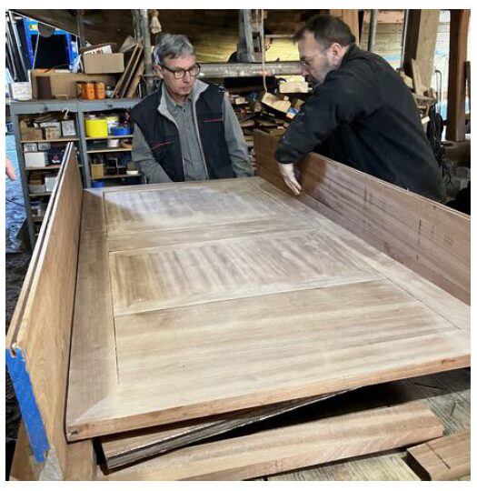 Tout d’abord il faut approvisionner du bois. Tout le bateau est construit en chêne. Pour réaliser les différentes pièces, il faut un bois ne présentant pas de nœud, ce qui nuirait à la résistance. Pour les pièces courbe des membrures il faut trouver du bois tor, qui suit à peu près la courbe de la membrure. Seuls quelques marchands très spécialisés sont capables de nous fournir cette qualité de bois. Nous sommes allés à Craon, au-delà de Chateaubriant pour nous procurer du bois auprès de la société « Le Bois Idéal ».