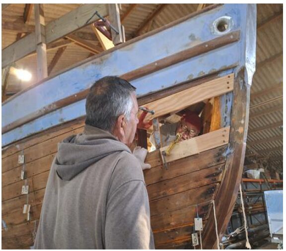 En décembre 2023, après une petite promenade sur les chemins de la presqu’ile de Rhuys, elle est arrivée au chantier des Vieilles Voiles de Rhuys au Pouldu.