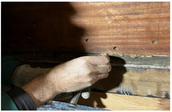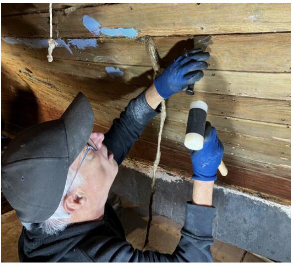 Plusieurs passes peuvent être nécessaires pour que le calfatage soit suffisant. Écouter le bruit du maillet (le bruit du maillet devient sourd quand l’espace est bien comblé) … On laisse au minimum 5mm libres sur l’épaisseur de chaque côté du bordé (intérieur et extérieur).